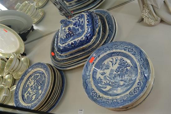 COLLECTION OF MATCHED WILLOW PATTERN CHINA INCLUDING DINNER PLATES, BOWLS, PLATTERS, TUREEN ETC (SOME FAULTS)