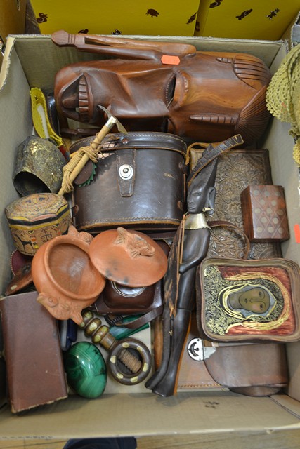 ONE BOX INCLUDING ZEISS IKON CAMERA, CANON BINOCULARS, WOODEN BOXES, BOXED VINTAGE MINIATURE IRON, ICON ETC