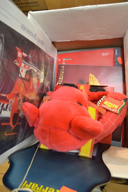 A BOX OF ASSORTED FORMULA 1 RELATED ITEMS INCLUDING BOXED FERRARI BEAR, BOOKS ETC