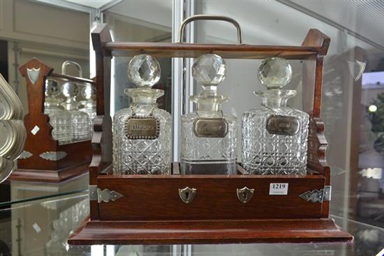 AN EDWARDIAN THREE BOTTLE TANTALUS WITH THREE STERLING BOTTLE LABELS (KEY WITH STAFF)