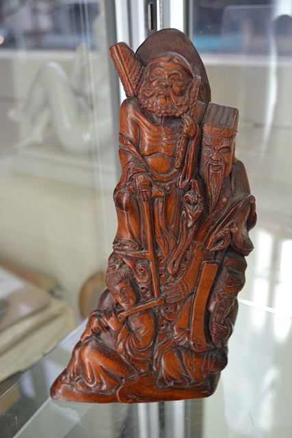 ELABORATELY CARVED TIMBER FIGURAL GROUP OF FOUR MEN