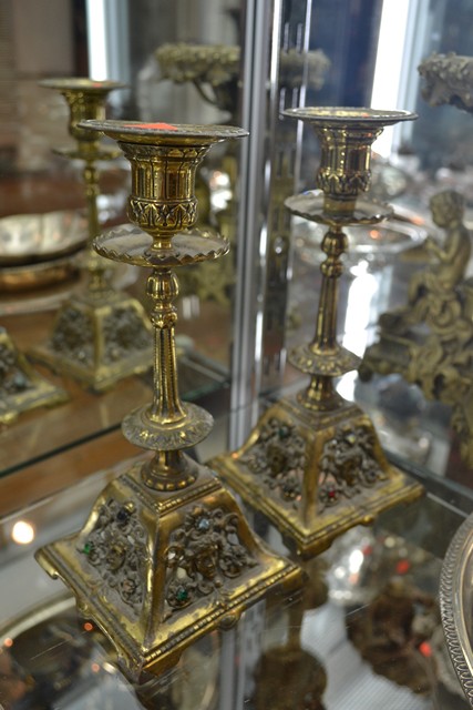 A PAIR OF EARLY 20TH CENTURY BRASS CANDLESTICKS WITH RHINESTONE ADORNMENTS