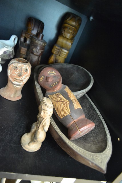 A GROUP OF WOOD CARVED TRIBAL ITEMS INCLUDING TOTEM FIGURES, BOWLS ETC
