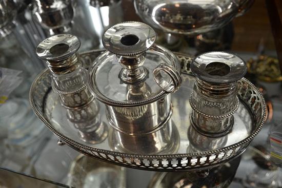 VICTORIAN SILVER PLATE DESK SET WITH GALLERY EDGE