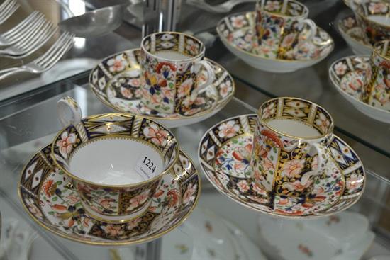 TWO 19TH CENTURY DERBY IMARI COFFEE CANS AND SAUCERS AND ONE OTHER TEA CUP AND SAUCER