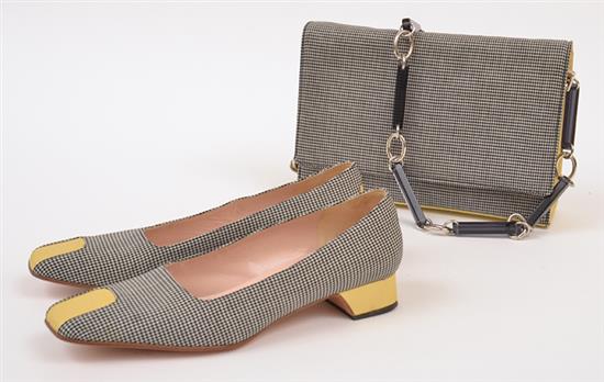 Styled in a black and white houndstooth fabric with contrast lemon leather, the shoulder strap with silver metal and black perspex links, 24 x 14 x 6cm, with a pair of conforming shoes, labelled size 38C.