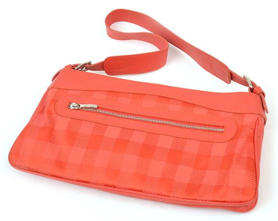 Styled in coral mono-checked canvas with complimenting leather trim and silver metal hardware, 34 x 18cm, conforming purse included.