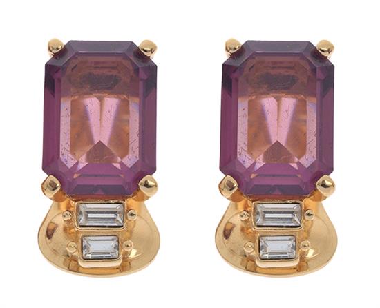 The art deco style earrings set with clear and purple paste, in gilt metal to clip fittings.