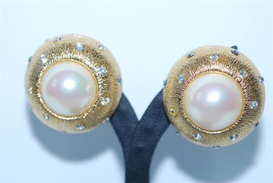 Centrally set with a faux button pearl surrounded by clear paste, in gilt metal to clip fittings.