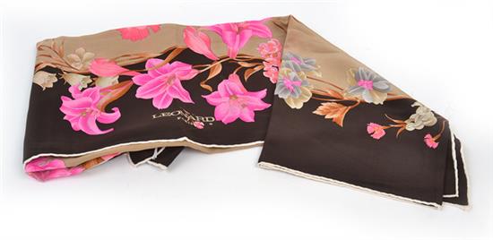 Of floral design in shades of pink, on a beige and chocolate brown background, 85cm square.