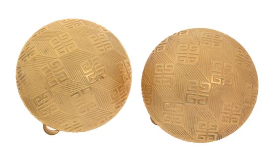 The domed earrings with monogram design, in a textured gilt metal to clip fittings.