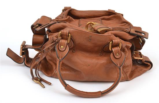 Styled in textured tan leather with feature saddle stitching and gold metal hardware, 26 x 26 x 16cm.