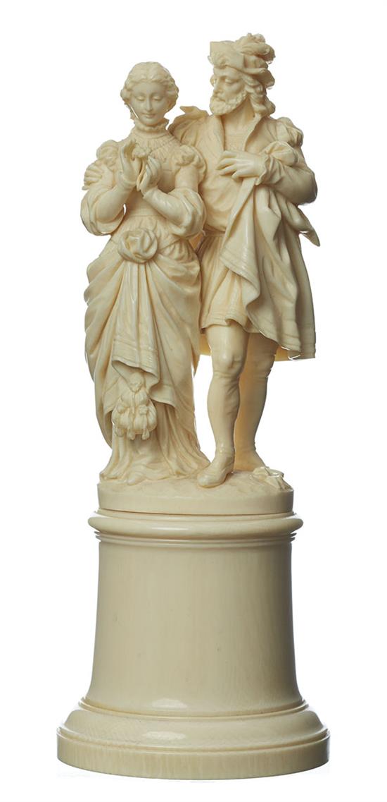 Depicting a courting couple of dignitaries in late 17th century dress, set upon an ivory cylindrical plinth, 21cm in high.