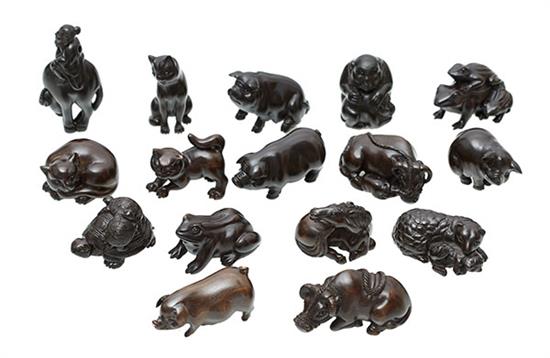 A LARGE GROUP OF NETSUKE CARVED WOOD ANIMALS, 19TH/20TH CENTURY