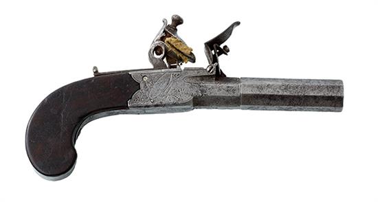 A FLINT LOCK TRAVELLING PISTOL WITH FOLDING TRIGGER, CIRCA 1790- 1820