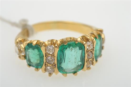Featuring three cushion cut emeralds totalling 4.03cts, having old European cut diamond detail throughout, mounted in 18ct gold, ring size P.