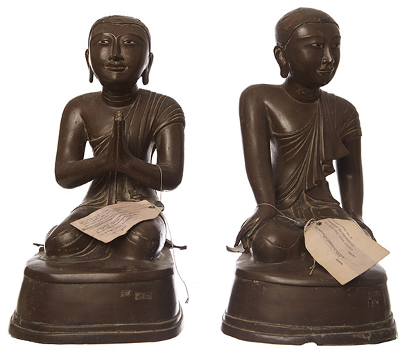 A PAIR OF BURMESE BRONZE FIGURES OF BUDDHIST SEATED MONKS, MANDALAY PERIOD