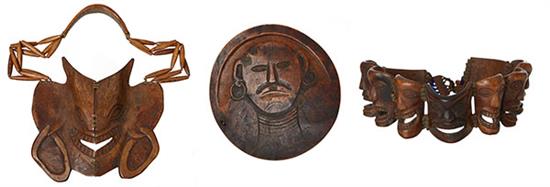 Comprising a breast plate, shield with cared portrait and trophy head belt, latter 74cm long (3).