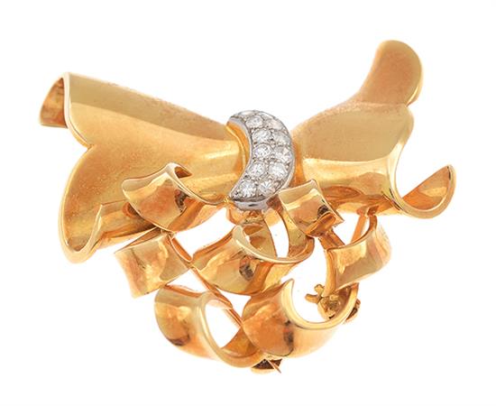 Of stylised bow and scroll design, having a central knot set with round brilliant cut diamonds, in 18ct gold.