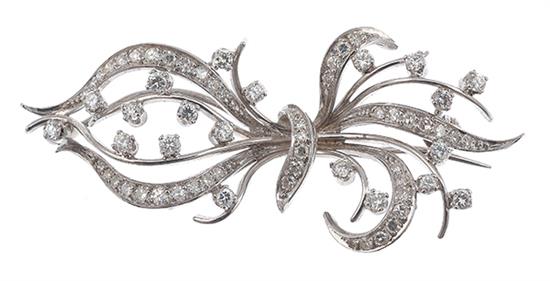 The stylised floral spray set throughout with round brilliant and single cut diamonds, mounted in 14ct white gold, circa 1950.