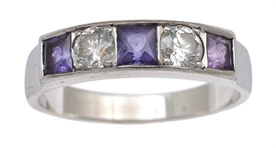 Comprising three princess cut purple sapphires interspaced with two round brilliant cut diamonds, mounted in 18ct white gold, ring size O.