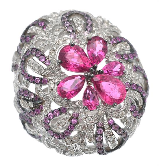 The pierced domed panel centrally set with a tourmaline flower, surrounded by round brilliant cut diamonds totalling 2.18cts, mounted in 18ct white gold, ring size M-N.
