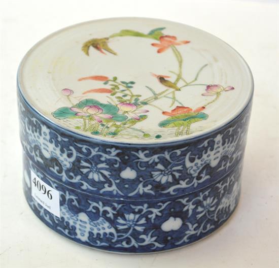 famille rose lotus and bird scene to lid, underglazed blue bat and peach motif to border, pseudo under glazed blue Daoguang seal mark to base, overall height 7cm, 12.5cm diameter