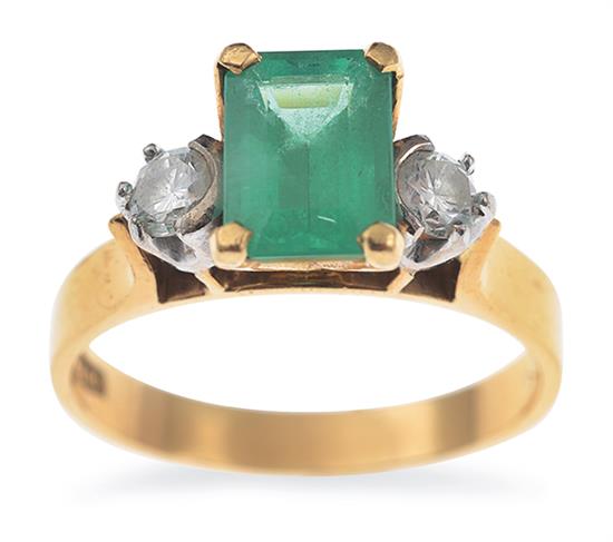 The emerald cut emerald of 1.32cts, flanked by two brilliant cut diamonds totalling 0.16cts, mounted in 18ct gold, ring size M.