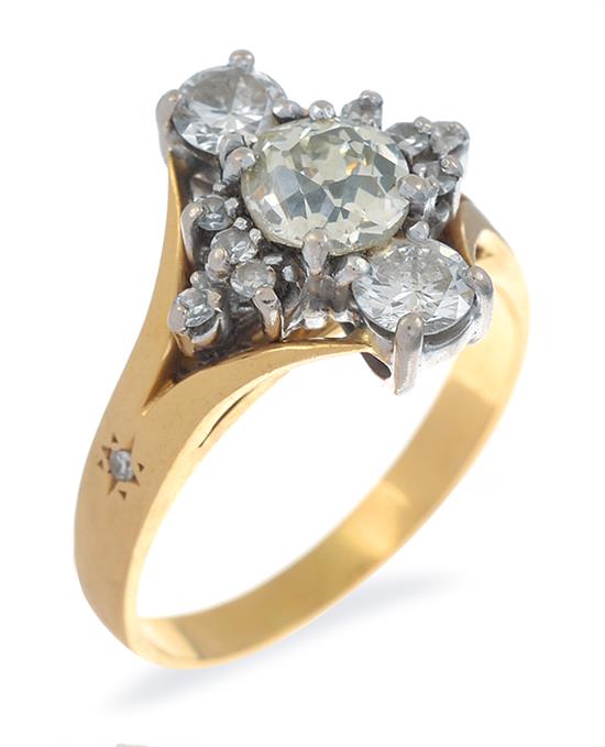 Featuring an old European cut diamond of 0.60cts flanked vertically by two brilliant cut diamonds totalling 0.45cts with further diamonds set to the shoulders, mounted in 18ct gold, ring size N.