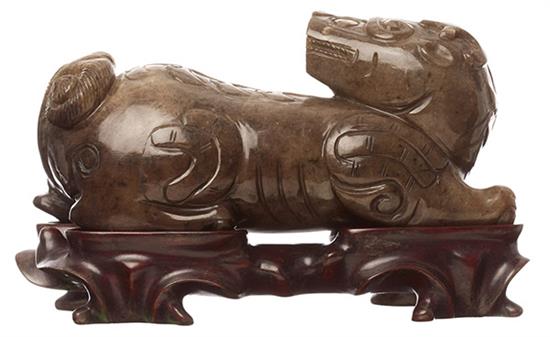 Carved from grey green jade, depicting the ancient auspicious animal figure 'Brave Troops' displays a cow's mouth, sheep's tail, horse's hoof and of dog form, 17cm length.