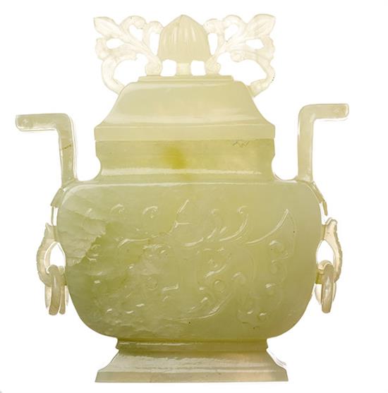 With double ring handles, the body carved with scroll motifs, the cover with flower finial, 16cm high.