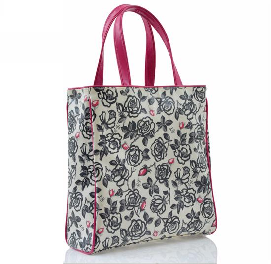 Styled in coated canvas with black flowers on a white background, with pink handles and trim, 30 x 32 x 11cm.