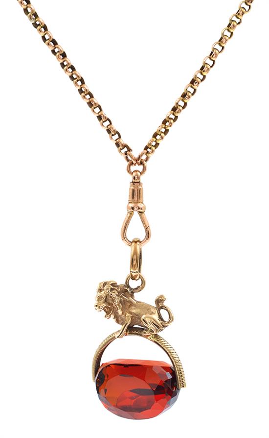 The belcher link chain fitted with a swivel clip stamped 9ct gold, total length 1500mm, together with a spinner set with a faceted orange paste and surmounted with a lion.