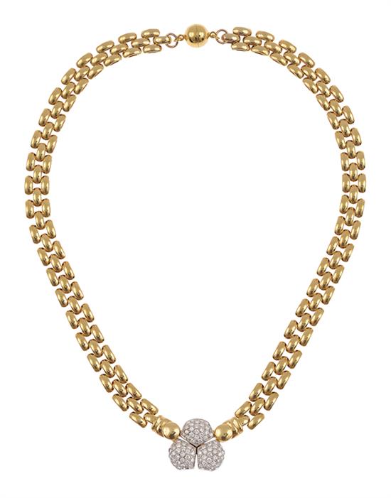 Centrally set with a trefoil of pave set diamond petals, suspended from an Italian brick link necklace, all in 14ct gold.