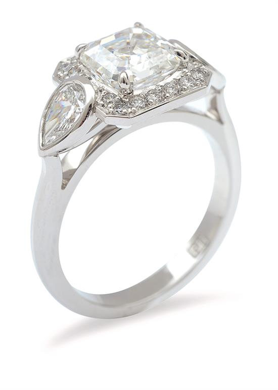 The square emerald cut diamond of 2.02cts, with GIA diamond certificate stating colour E and clarity SI 1, shouldered by two pear cut diamonds of 0.31cts and 0.30cts respectively, with GIA diamond certificate stating colour E and clarity Internally Flawless, surrounded by further brilliant cut diamonds, mounted in platinum, ring size L.