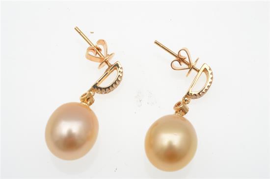 A PAIR OF GOLDEN SOUTH SEA PEARL AND DIAMOND EARRINGS