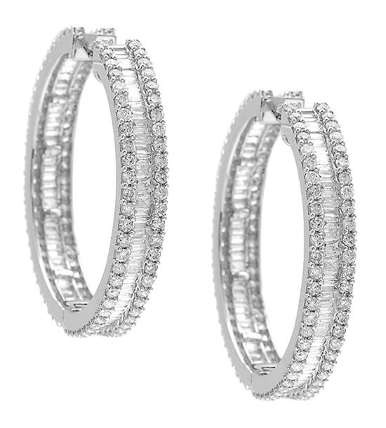 Each hinged earring channel set with baguette cut diamonds bordered by round brilliant cut diamonds, all totalling 1.95cts, mounted in 18ct white gold.