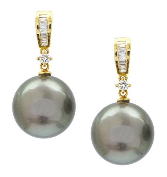 A PAIR OF TAHITIAN PEARL AND DIAMOND EARRINGS