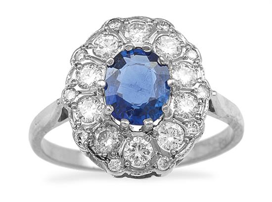 The oval cut sapphire of 1.05cts, surrounded by twenty round brilliant cut diamonds totalling 0.75cts, mounted in 18ct white gold, ring size O.