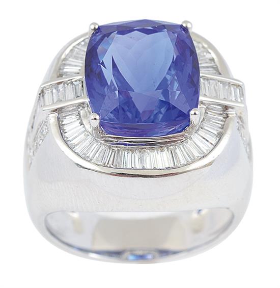 Centrally set with a cushion cut tanzanite of 12.15cts, with round brilliant and baguette cut diamonds to the surround and shoulders totalling 1.40cts, mounted in 18ct white gold, ring size S.