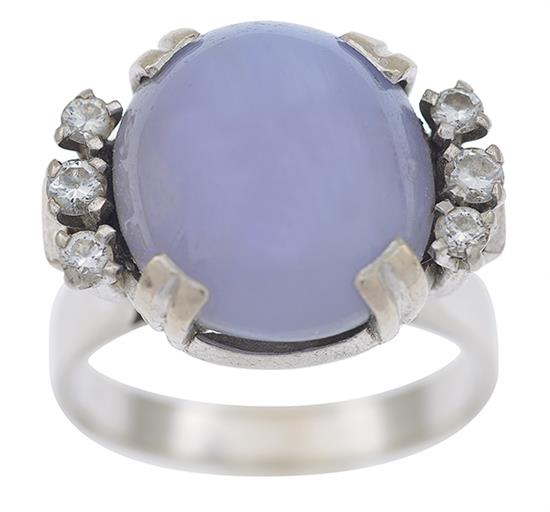 The oval Sri Lankan sapphire cut en cabochon, flanked by round brilliant cut diamonds, mounted in 18ct white gold, ring size N.