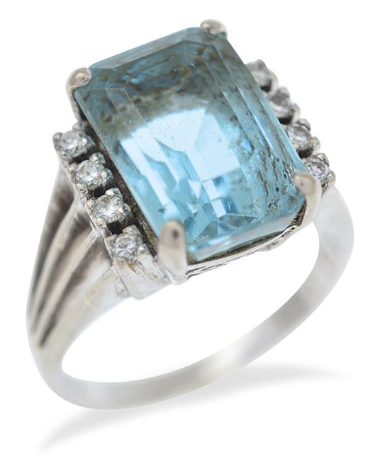 Centrally set with an emerald cut aquamarine of 6.72cts, flanked by round brilliant cut diamonds, mounted in white gold, ring size N.
