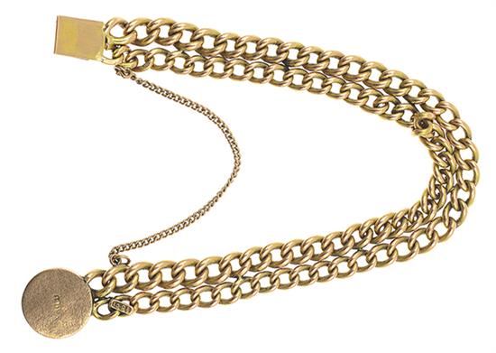 The double curb link bracelet with a disc clasp, mounted in 15ct gold, total length 190mm.