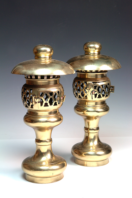A PAIR OF ALTAR LAMPS, for oil, a central latticed container with swinging door, on a stemmed foot, Circa 1900, 33 cm high