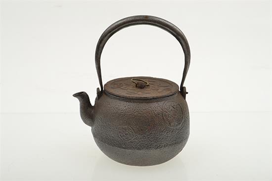 AN IRON TEAPOT, cartouches with family crests and lettering on lid, 24cm total high