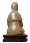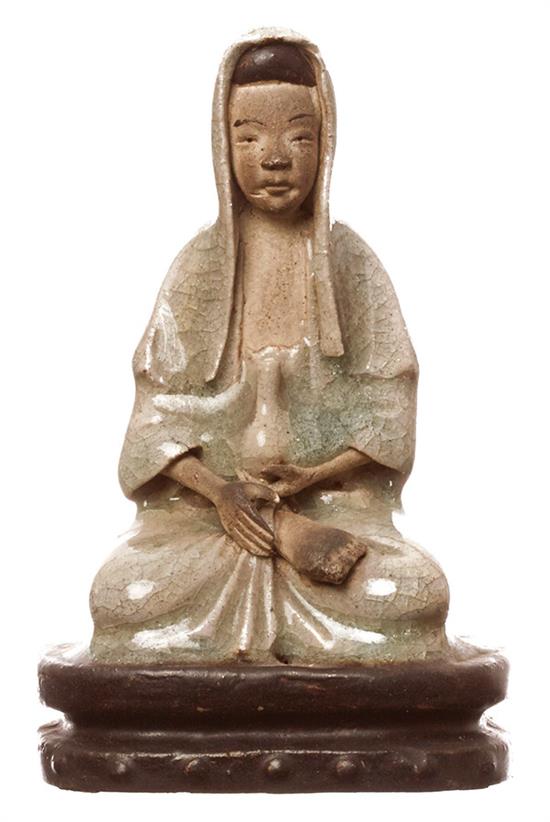With crackle glaze to body and unglazed face, hands and feet, seated wearing a long coat, dressed in a head scarf and holding a bottle, 11.5cm high.