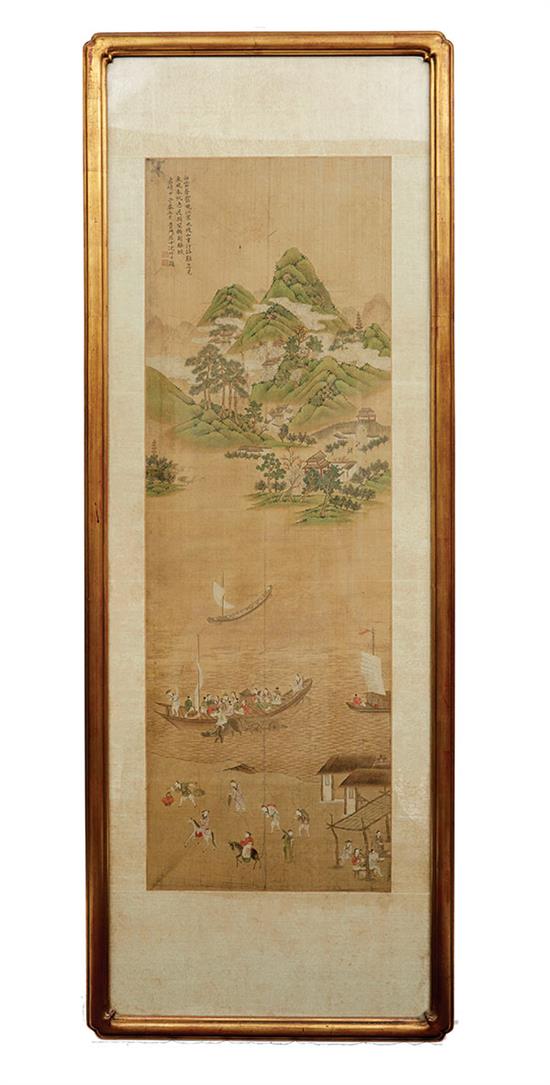 The painting depicts the landscape of a ferry and passengers, with distant city walls, houses, mountains and lake, 121cm height x 40cm width.