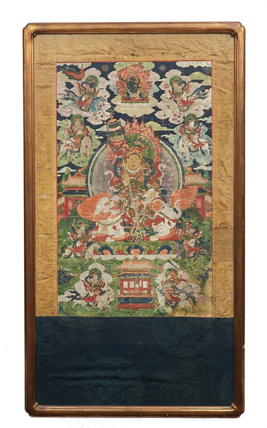 Depicting the central King Buddha riding a lion, his custodians guarding him whilst riding various types of animals.