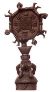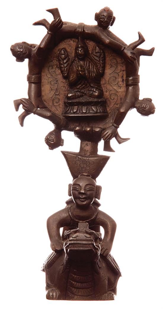 The upper figure depicts four boys holding hands encircling a Buddha sitting in the centre, the lower section depicts a boy riding a turtle, 20cm high.