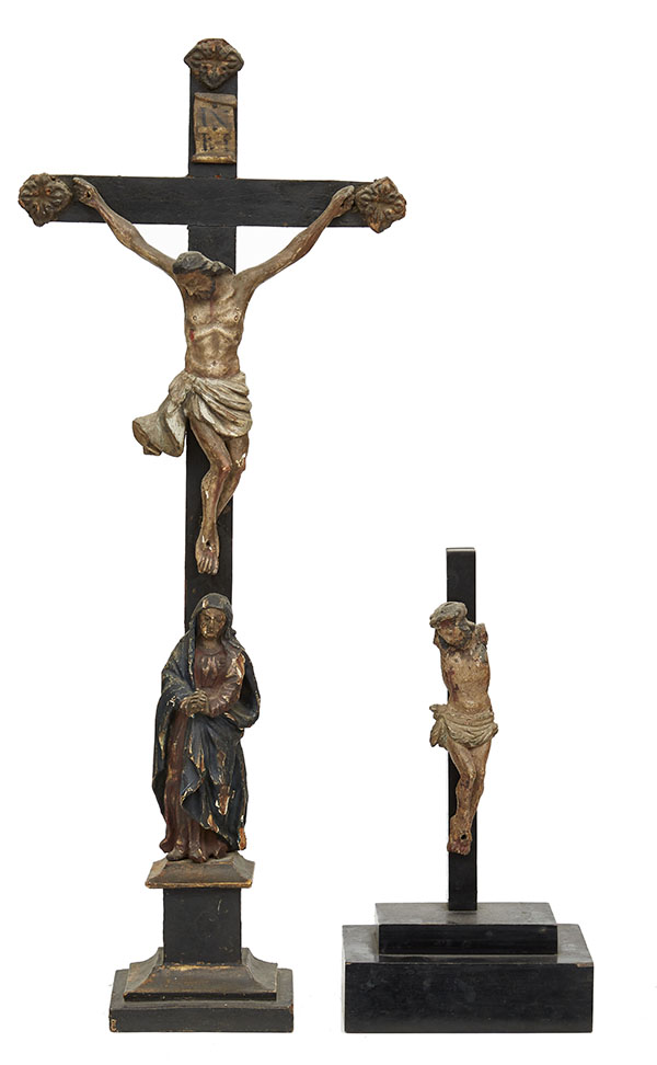 With remnants of painted gesso, the Christ figure mounted on ebonised cross with figure of Mary at his feet on stepped base, together with another small 17th century figure mounted on contemporary stand, 66cm and 32cm high (2).